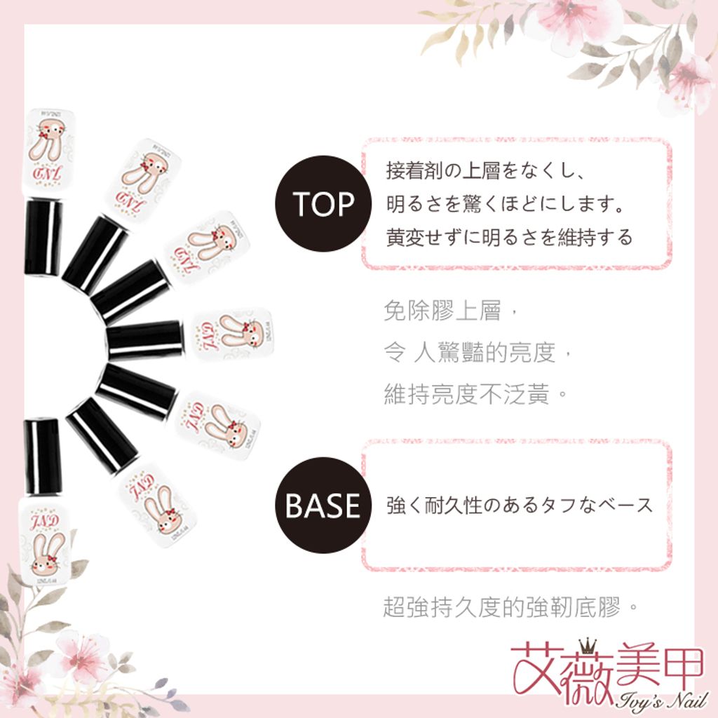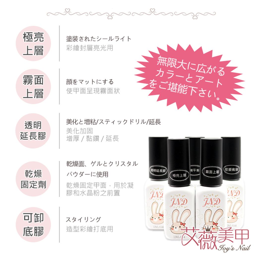 功能:用於底膠之後,硬度高,增加指甲厚度不易斷裂,持久效果加倍。