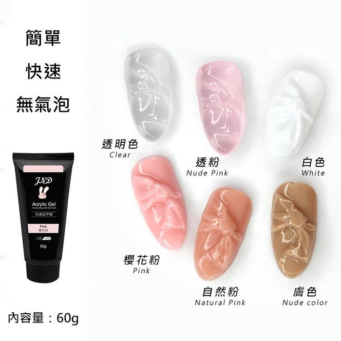 品       名:JND 快速延甲膠60g 全套6色+甲模+甲模固定夾3入 免紙托